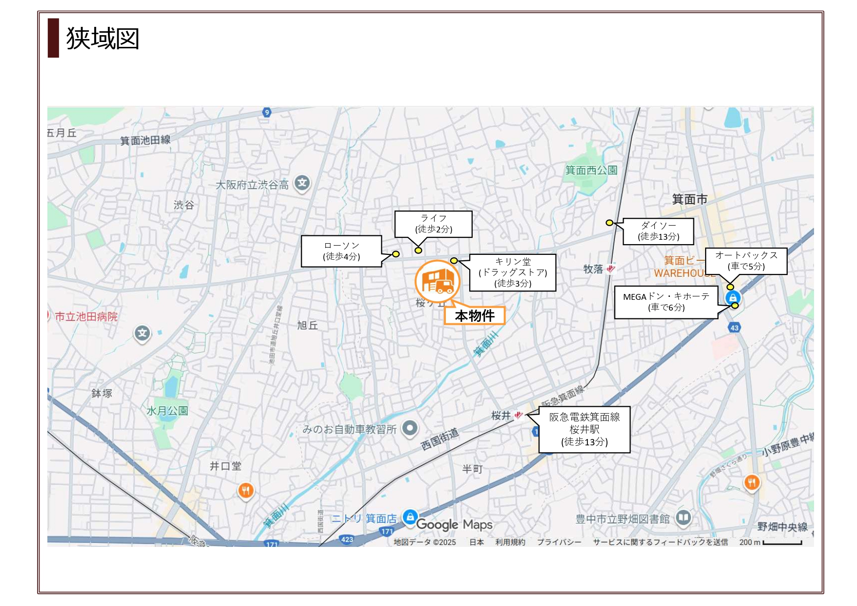 阪急電鉄箕面線「桜井駅」まで1.0km(徒歩13分)、「牧落駅」まで1.1km(徒歩14分)