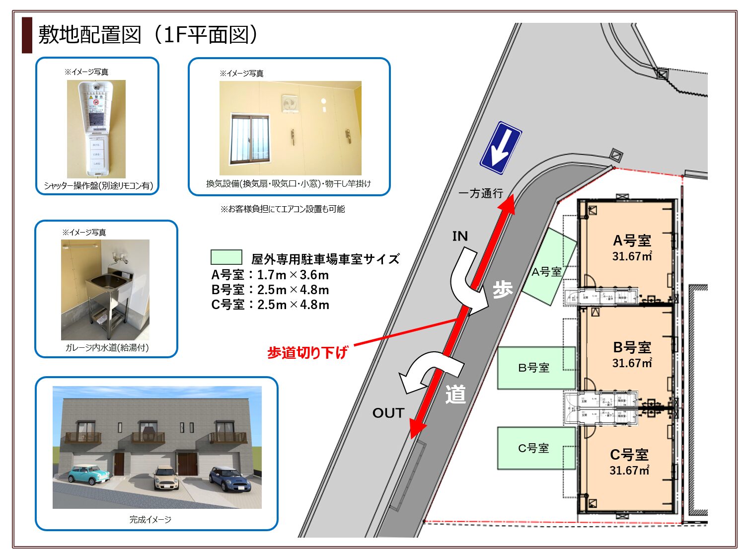 車2台分収容可能ガレージ+1LDK の居住スペース+屋外専用駐車場(車1台分)