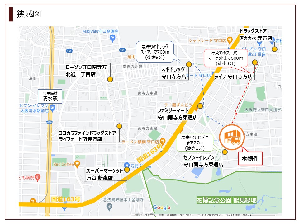 - ・最寄りの清水駅から関目成育駅まで2駅4分。関目成育駅から京阪本線「関目駅」まで徒歩