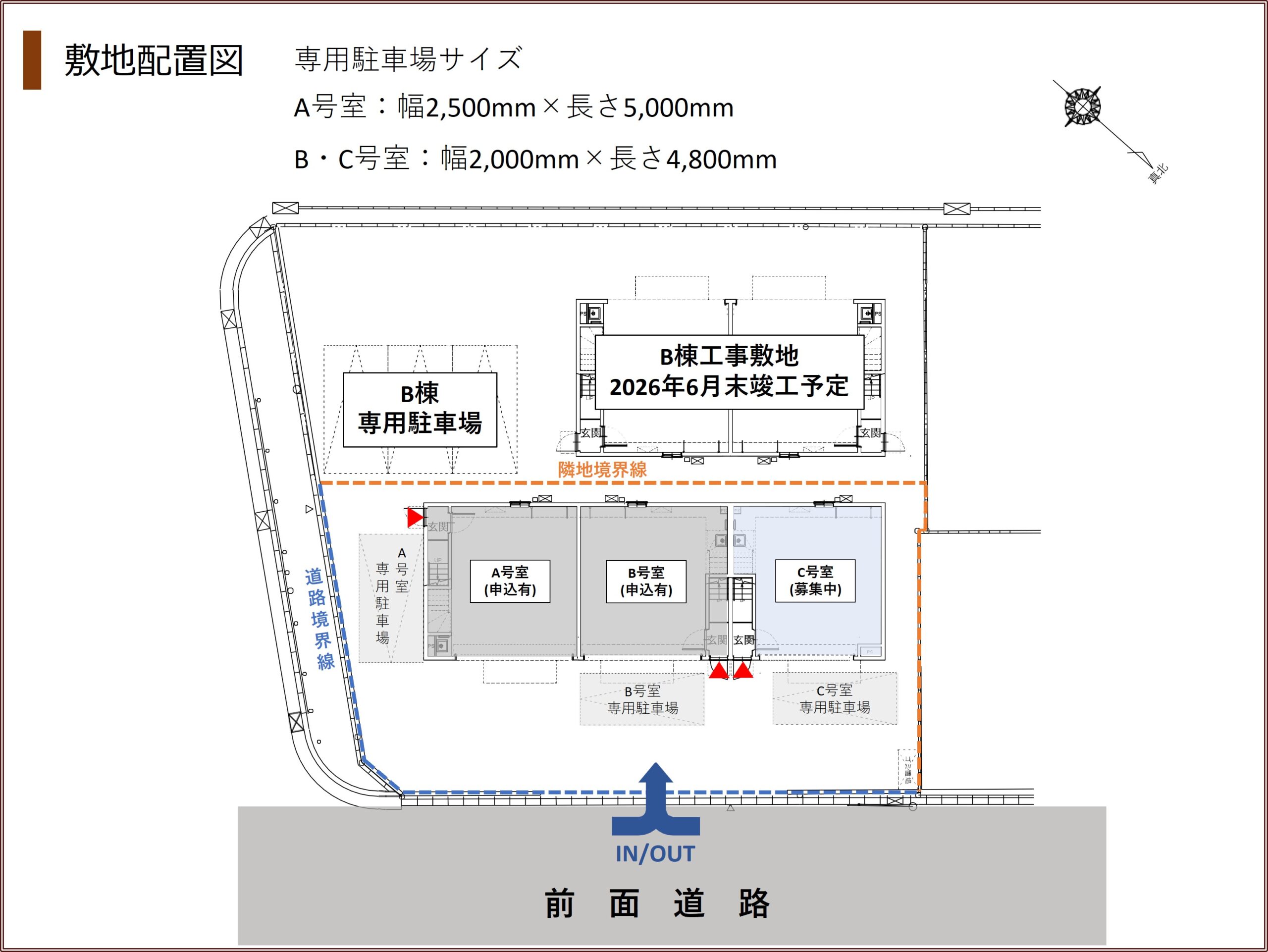 屋外には各戸車1台分の専用駐車場あり