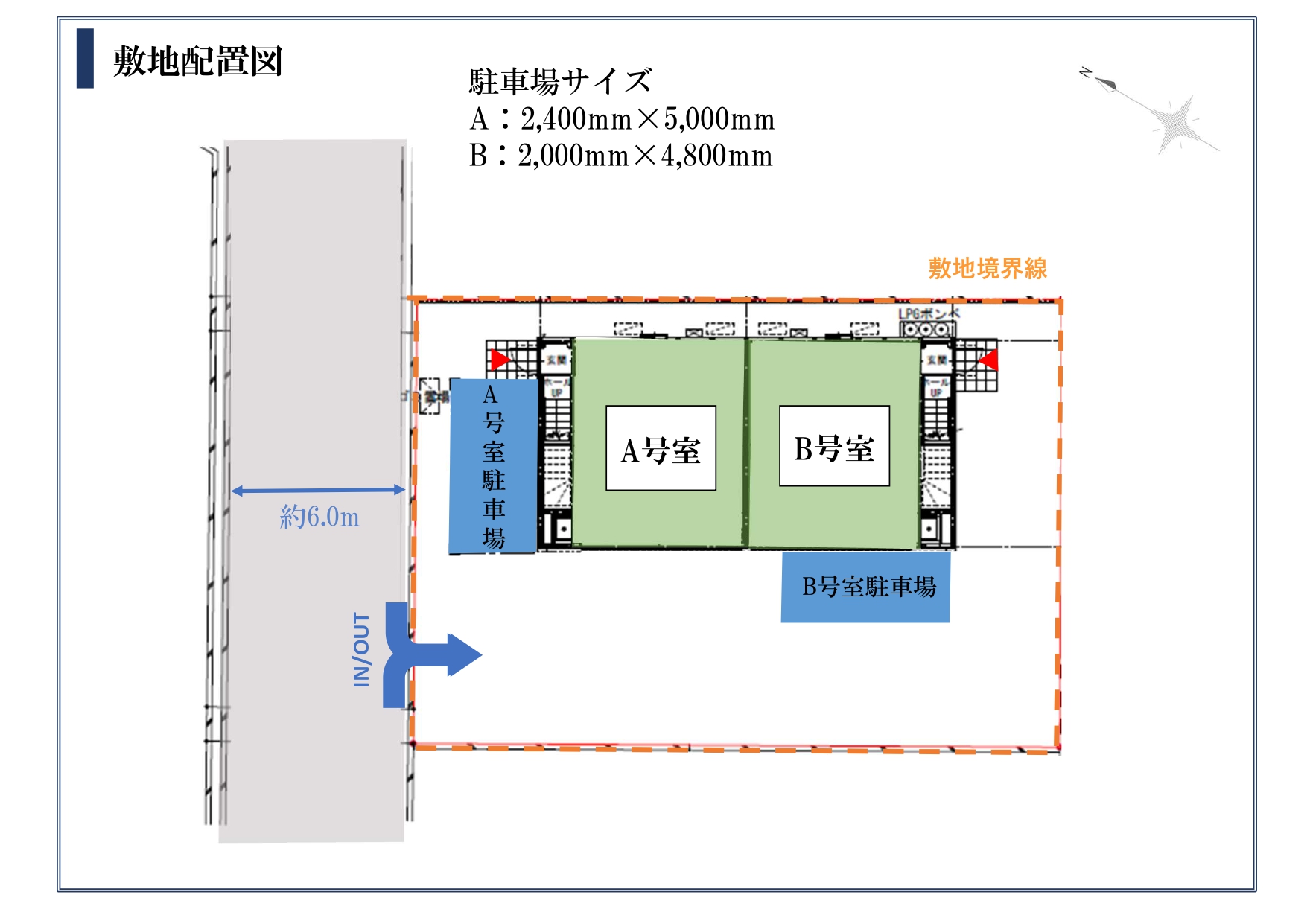 - A・B号室ガレージ幅芯々約5.0m×奥行芯々約6.0m