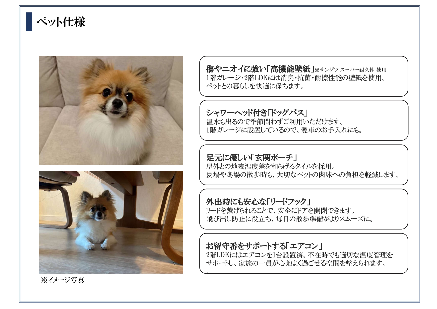 ペット用洗場(ドッグバス、シャワー栓)、玄関扉横:リードフック有、玄関ポーチ有(タイル貼仕様)