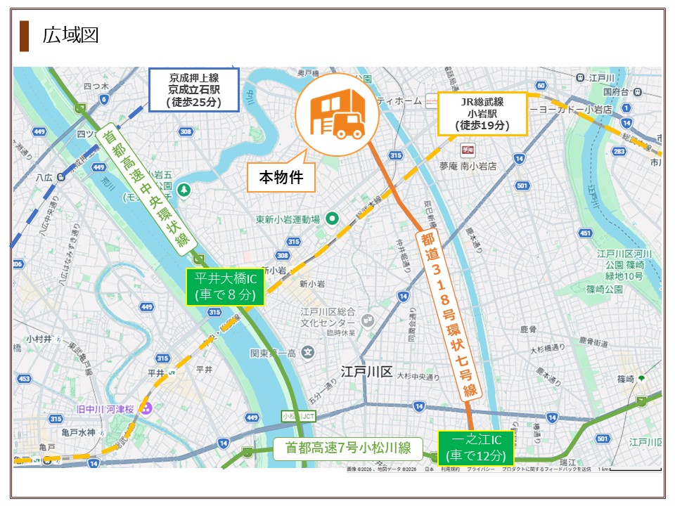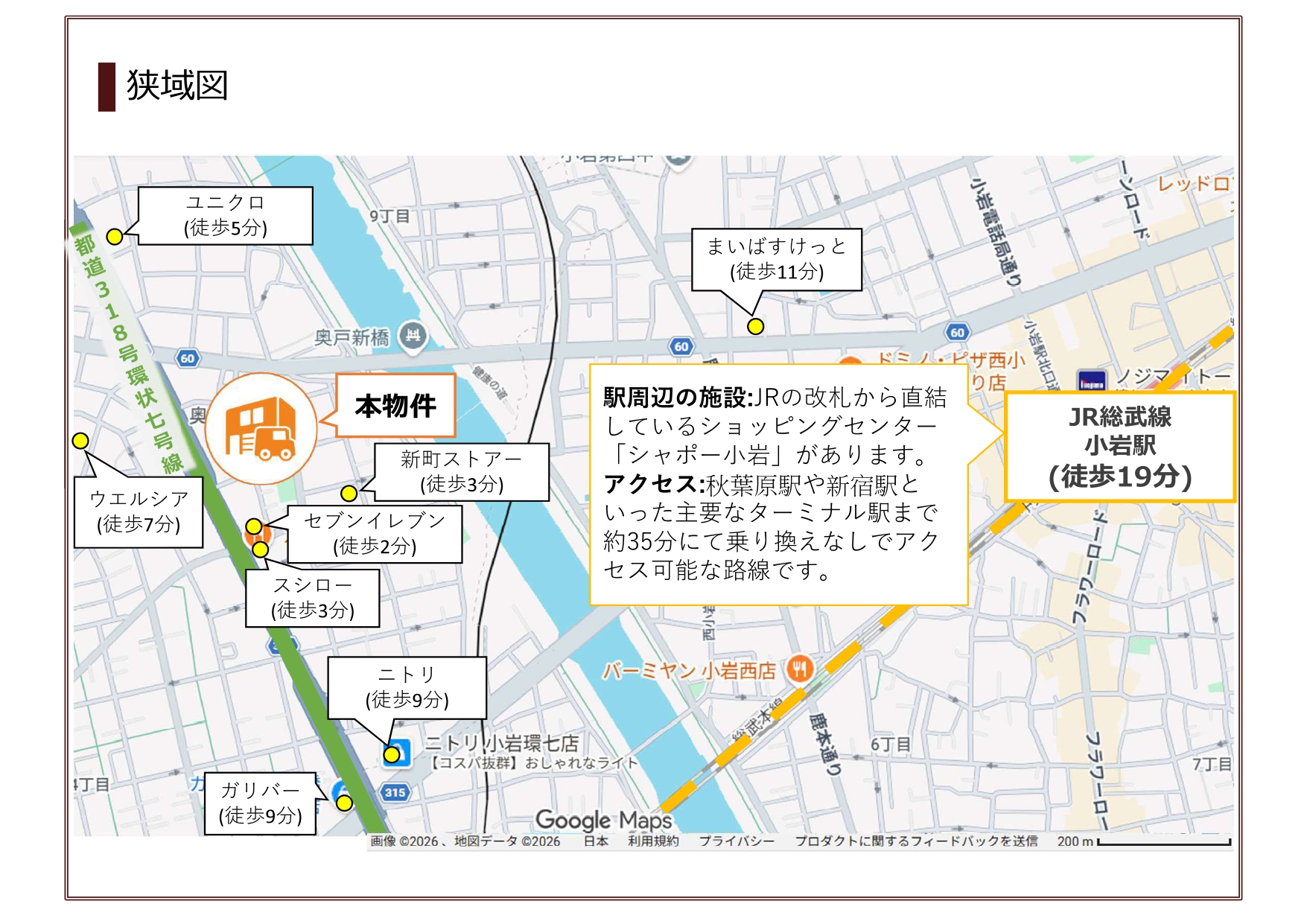 - JR総武線「小岩駅」まで1.5km(車で約6分/徒歩19分)